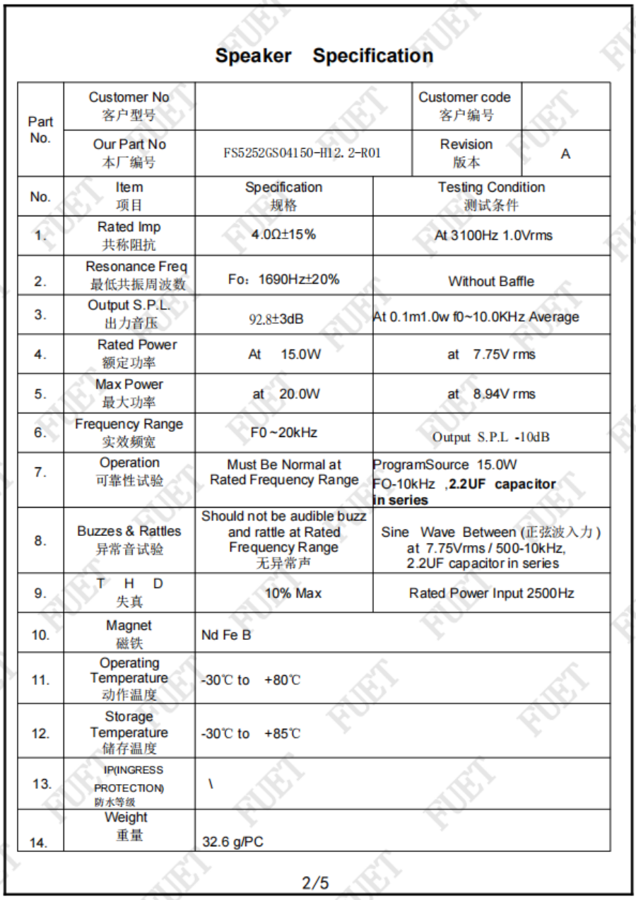 | 阻抗 | 4.0Ω±15% | At 3100Hz 1.0Vrms |